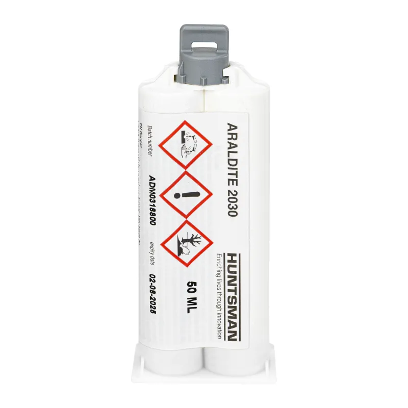 L'Araldite 2030 est un adhésif époxy bicomposant multifonctionnel qui durcit à température ambiante. La colle peut facilement être traitée à partir d'une double seringue, ce qui garantit que la résine et le durcisseur sont toujours dosés à parts égales.